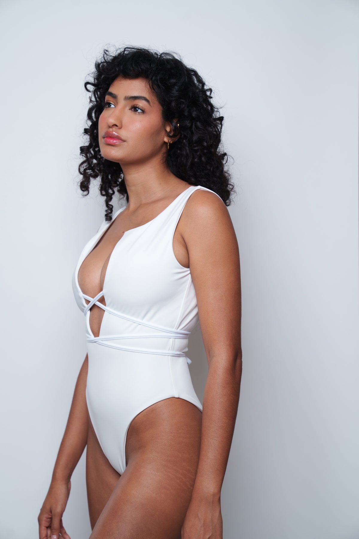 The Pia one-piece blurs the line between swimwear and bodysuit. Triple-lined in white to keep secrets safely under wraps, it features delicate spaghetti straps that wrap the waist for a snatched silhouette and a plunging neckline that’s daring and fun—yet still undeniably classy.